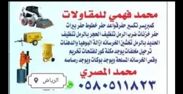 مقاول عمال لجميع تنفيز الشغل مكنة كور لتخريم الخرسانه وفتحات السباكه فتحات تهوية فتحات المكيفات ويوجد منشار لقص وتقطيع الخرسانه المسلحة ويوجد كمبريسر تكسير حفرقواعد حفر خطوط حفر بيرات حفر خزنات قص اسفلت ضرب الرمل تنظيف الحجر بالرمل تنظيف الحديد بالرمل تخشين الخرسانه ازالة البوهيا والدهنات ترحيل مخلفات يوجدبوكات ويوجد رصاصه التواصل الاجتماعي 0580511823